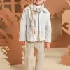 Για τους μικρούς κυρίους που αγαπούν το στυλ και τη λεπτομέρεια, αυτό το σετ υπόσχεται να εντυπωσιάσει σε κάθε ιδιαίτερη περίσταση. Το δίπιετο παντελόνι με το λοξό κούμπωμα συνδυάζεται τέλεια με το σταυρωτό γιλέκο και τα δύο από tencel-cotton-linen ύφασμα σε ανοιχτή μπεζ απόχρωση. Το off white βαμβακερό πουκάμισο με τον ιδιαίτερο Mao γιακά μαζί με το φουλάρι από τσαλακωμένο βουάλ σε λευκό χρώμα συμπληρώνουν ιδανικά το look. Για το τελικό στυλ μπορείτε να επιλέξετε ανάμεσα στο ψάθινο καπέλο ή την υφασμάτινη τραγιάσκα, ανάλογα με την προτίμησή σας.
