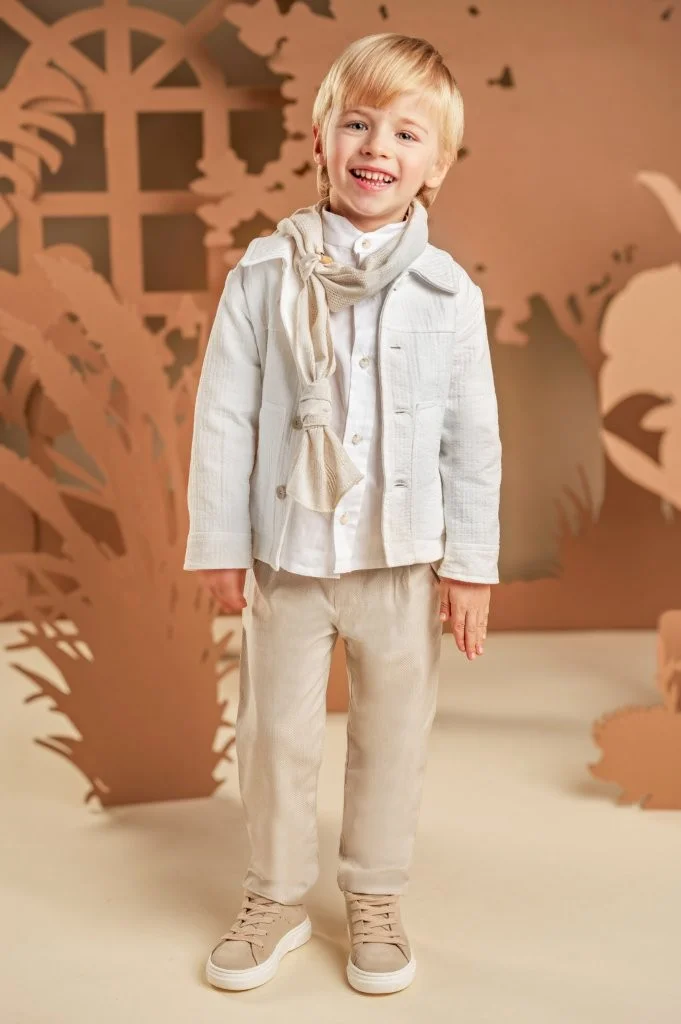 Ένα σύνολο φωτεινό και μοναδικό για ξεχωριστές εμφανίσεις. Το σετ περιλαμβάνει παντελόνι από τtwill Tencel-cotton-linen ύφασμα σε μπεζ αποχρώσεις και μπουφανάκι με γιακά και εξωτερικές τσέπες από γκοφρέ βαμβακερό ύφασμα σε off white χρώμα. Το λευκό βαμβακερό πουκάμισο με τον ιδιαίτερο Mao γιακά ολοκληρώνει χρωματικά το look, ενώ το μακρόστενο υφαντό φουλάρι σε μπεζ αποχρώσεις προσθέτει μια διακριτική, ξεχωριστή πινελιά. Για την τελική λεπτομέρεια, επιλέξτε ανάμεσα σε ψάθινο καπέλο ή υφασμάτινη τραγιάσκα, σύμφωνα με το προσωπικό σας στυλ.