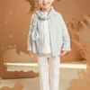 Για εμφάνιση που ξεχωρίζει, αυτό το αγορίστικο σύνολο εντυπωσιάζει με την αρμονία των χρωμάτων και το ιδιαίτερο στυλ του. Το σετ περιλαμβάνει λευκό παντελόνι από cotton-linen ύφασμα με ιδιαίτερες reverse πιέτες και συνδυάζεται με σταυρωτό γιλέκο σε σιελ μελανζέ βαμβακερό ύφασμα και off white βαμβακερό πουκάμισο. To look ολοκληρώνει το φουλάρι από βαμβακερό ύφασμα με μοναδικό baby bloom exclusive φλοράλ εμπριμέ σε σιελ αποχρώσεις, παπιγιόν και ανάλογα με το στιλ που προτιμάτε ψάθινο καπέλο ή υφασμάτινη τραγιάσκα.