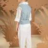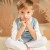 Για εμφάνιση που ξεχωρίζει, αυτό το αγορίστικο σύνολο εντυπωσιάζει με την αρμονία των χρωμάτων και το ιδιαίτερο στυλ του. Το σετ περιλαμβάνει λευκό παντελόνι από cotton-linen ύφασμα με ιδιαίτερες reverse πιέτες και συνδυάζεται με σταυρωτό γιλέκο σε σιελ μελανζέ βαμβακερό ύφασμα και off white βαμβακερό πουκάμισο. To look ολοκληρώνει το φουλάρι από βαμβακερό ύφασμα με μοναδικό baby bloom exclusive φλοράλ εμπριμέ σε σιελ αποχρώσεις, παπιγιόν και ανάλογα με το στιλ που προτιμάτε ψάθινο καπέλο ή υφασμάτινη τραγιάσκα.