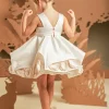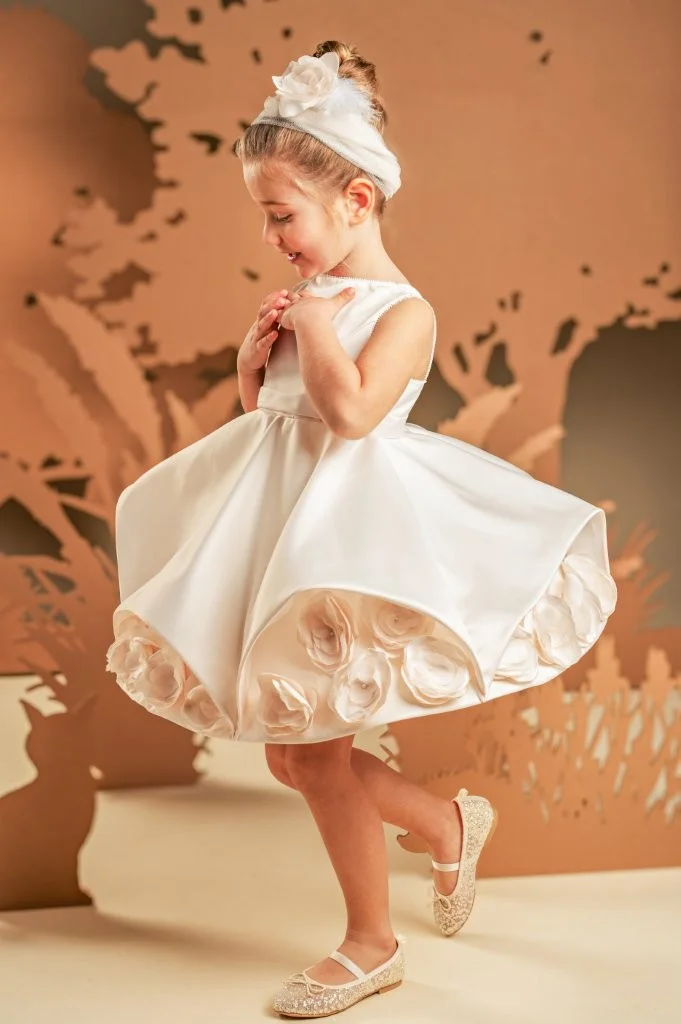 Ένα φόρεμα που συνδυάζει την καθαρότητα της γραμμής με ποιητική ρομαντική διάθεση σε απαλή απόχρωση πούδρας, φτιαγμένο εξολοκλήρου από σατέν ντουσέζ ύφασμα που χαρίζει διακριτική λάμψη. Το μπούστο μπροστά είναι λιτό και αυστηρά καθαρό στις γραμμές ενώ η πλάτη κλέβει διακριτικά την παράσταση με εντυπωσιακές φαρδιές τιράντες, προσθέτοντας σύγχρονη αισθητική στο σχέδιο. Η φούστα ομπρέλα με ασύμμετρες μύτες κινείται με χάρη σε κάθε βήμα, ενώ στο τελείωμά της «ανθίζουν» χειροποίητες υφασμάτινες παιώνιες — μία ρομαντική πινελιά που ισορροπεί ιδανικά με τη λιτότητα του υπόλοιπου σχεδίου. Το σύνολο ολοκληρώνεται με κορδέλα μαλλιών διακοσμημένη με χειροποίητο λουλούδι, δημιουργώντας μια απόλυτα αρμονική εικόνα.