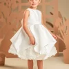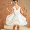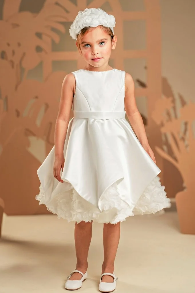 Ένα φόρεμα που συνδυάζει την καθαρότητα της γραμμής με την ποιητική ρομαντική διάθεση σε off white απόχρωση, φτιαγμένο εξολοκλήρου από σατέν ντουσέζ ύφασμα που χαρίζει διακριτική λάμψη. Το μπούστο μπροστά είναι λιτό και αυστηρά καθαρό στις γραμμές ενώ η πλάτη κλέβει διακριτικά την παράσταση με εντυπωσιακές φαρδιές τιράντες, προσθέτοντας σύγχρονη αισθητική στο σχέδιο. Η φούστα ομπρέλα με ασύμμετρες μύτες κινείται με χάρη σε κάθε βήμα, ενώ στο τελείωμά της «ανθίζουν» υφασμάτινα τριαντάφυλλα, μία ρομαντική πινελιά που ισορροπεί ιδανικά με τη λιτότητα του υπόλοιπου σχεδίου. Το σύνολο ολοκληρώνεται με κορδέλα μαλλιών διακοσμημένη με υφασμάτινα αλπικέ τριαντάφυλλά ίδια με του φορέματος, δημιουργώντας μια απόλυτα αρμονική εικόνα.