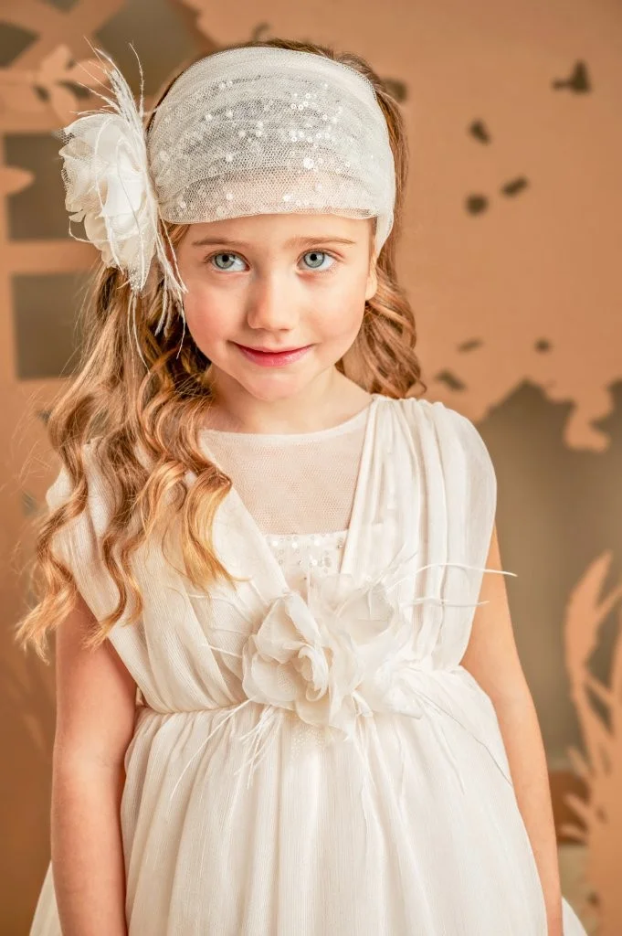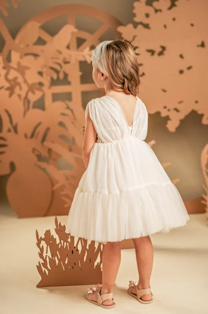 Ένα «ζαχαρωτό» φόρεμα στις αποχρώσεις της πούδρας, φτιαγμένο από γκοφρέ μουσελίνα και μαλακό τούλι. Το μπούστο ντουμπλαρισμένο στο στήθος με ύφασμα από παγιέτες για επιπλέον λάμψη, διαθέτει ντραπαριστές τιράντες από μουσελίνα και ανοιχτή πλάτη. Η πλούσια φούστα με το φαρδύ βολάν στο τελείωμα στολίζεται κομψά με δύο υπέροχα χειροποίητα λουλούδια στους ίδιους χρωματισμούς. Το σύνολο ολοκληρώνεται με μια τούλινη κορδέλα με παγιέτες για τα μαλλιά, διακοσμημένη και αυτή με ένα μεγάλο χειροποίητο λουλούδι.