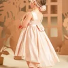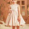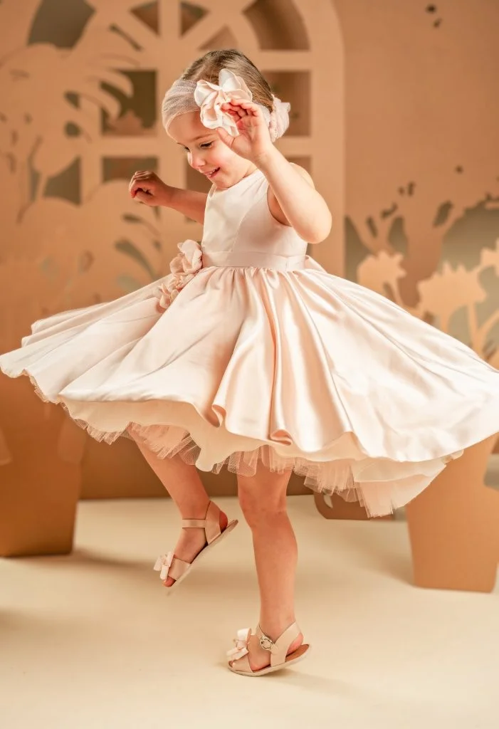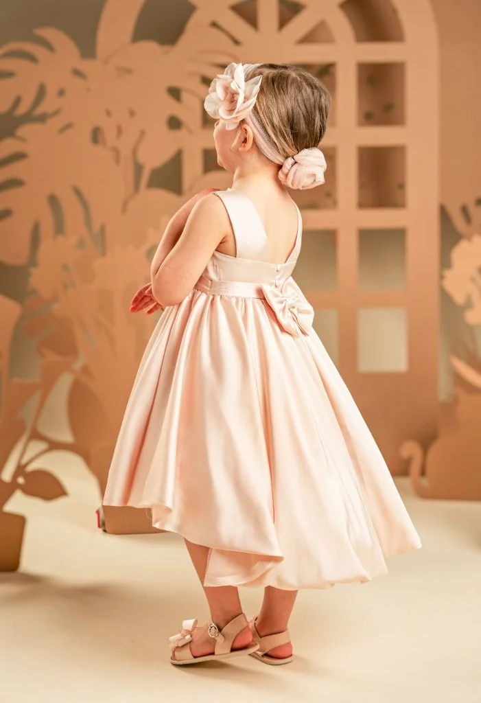 Ένα απλό αλλά αριστοκρατικό φόρεμα σε dusty pink αποχρωση, σε γραμμή princess που αποπνέει διαχρονική κομψότητα. Φτιαγμένο από ντραπαριστό σατέν ύφασμα, ξεχωρίζει για την εντυπωσιακή φούστα-ομπρέλα με την ουρά που χαρίζει υπέροχη κίνηση στο ρούχο. Το μπούστο μπροστά είναι απλό κρατώντας όλη την έκπληξη για το πίσω μέρος του φορέματος όπου φαρδιές τιράντες μαζί με έναν μεγαλοπρεπής φιόγκο στολίζουν την πλάτη. Το σύνολο ολοκληρώνεται με την τούλινη κορδέλα για τα μαλλιά διακοσμημένη με το υπέροχο χειροποίητο λουλούδι -ασορτί με αυτό του φορέματος- δημιουργώντας έναν απόλυτα αρμονικό συνδυασμό.