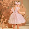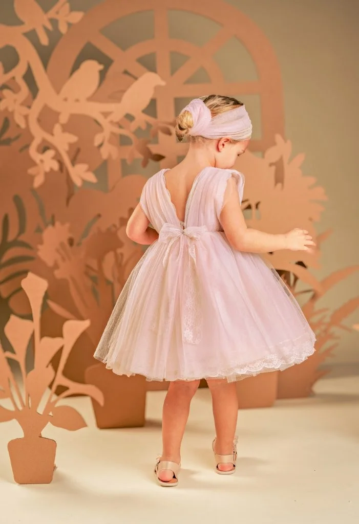 Ένα υπέροχο και αέρινο φόρεμα, φτιαγμένο από μαλακό τούλι σε απαλή απόχρωση του κυκλάμινου. Το μπούστο με πλούσιο ντραπέ στολίζεται κομψά με γαλλική δαντέλα, ενώ η φούστα με τις πολλαπλές στρώσεις από τούλι διακοσμείται με ένα χειροποίητο λουλούδι στο στήθος και ένα διακριτικό φιόγκο από δαντέλα στο πίσω μέρος. Η τούλινη κορδέλα για τα μαλλιά, διακοσμημένη επίσης με ένα μεγάλο λουλούδι και φτερά, ολοκληρώνει μοναδικά το ρομαντικό αυτό look.