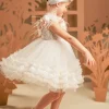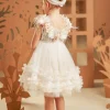 Αυτό το ονειρικό φόρεμα σε αποχρώσεις της πούδρας είναι η επιτομή της ρομαντικότητας. Το μπούστο, φτιαγμένο εξολοκλήρου από ντουμπλαρισμένη δαντέλα, αναδεικνύεται μέσα από την ανοιχτή λαιμόκοψη, περίτεχνα στολισμένη με χειροποίητα λουλούδια εκρού, μπεζ και misty rose. Οι λεπτομέρειες από αέρινα φτερά στρουθοκαμήλου και στρας χαρίζουν μια μαγευτική λάμψη, σαν ψίθυρος πολυτέλειας. Η φούστα, με την πλούσια σούρα από απαλό τούλι και δαντέλα, κινείται με χάρη και ελαφρότητα, ενώ μια σειρά από μικρά βολάν προσθέτει μια παιχνιδιάρικη πινελιά. Η εμφάνιση ολοκληρώνεται με κορδέλα για τα μαλλιά, διακοσμημένη με τα ίδια λουλούδια και φτερά του φορέματος, συνθέτοντας ένα σύνολο που θυμίζει να ξεπήδησε από παραμύθι.