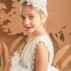 Ένα ρομαντικό και αιθέριο φόρεμα, φτιαγμένο από μαλακό τούλι σε απαλή απόχρωση του acquamarine. Το μπούστο με πλούσιο ντραπέ στολίζεται κομψά με γαλλική δαντέλα, ενώ η φούστα με τις πολλαπλές στρώσεις από τούλι διακοσμείται με ένα χειροποίητο λουλούδι σε παστέλ χρώματα στο στήθος και ένα διακριτικό φιόγκο από δαντέλα στο πίσω μέρος. Η τούλινη κορδέλα για τα μαλλιά, διακοσμημένη επίσης με ένα μεγάλο λουλούδι και φτερά, ολοκληρώνει μοναδικά το look.