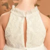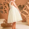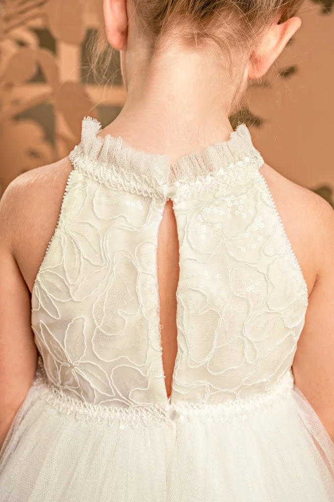 Ένα παραμυθένιο φόρεμα στο απαλό χρώμα της βανίλιας με ιδιαίτερο μπούστο και παρτούς ώμους, φτιαγμένο από κέντημένο τούλι κορδονέ με παγιέτες και βολάν στη λαιμόκοψη. Η τούλινη φούστα με τα πολλά layers χαρίζει αέρινη εικόνα, ενώ το χειροποίητο λουλούδι στο στήθος τονίζει τη μοναδικότητα του φορέματος. Το σύνολο ολοκληρώνεται με μια τούλινη κορδέλα για τα μαλλιά, διακοσμημένη με ένα μεγάλο χειροποίητο λουλούδι ασορτί με αυτό του φορέματος.