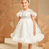 Ένα κουκλίστικο φόρεμα, φτιαγμένο εξολοκλήρου από μοναδικό ύφασμα με απλικέ κυματιστό μοτίφ σε off white απόχρωση, ντουμπλαρισμένο με τούλι γκλίτερ για διακριτική λάμψη. Το μπούστο απλό μπροστά, διαθέτει υπέροχη ανοιχτή πλάτη στο πίσω μέρος, ενώ η πλούσια φούστα μπαλούν με τη σατέν ζώνη στη μέση στολίζεται υπέροχα με σατέν φιόγκους. Το σύνολο ολοκληρώνεται με την τούλινη κορδέλα για τα μαλλιά διακοσμημένη με ένα μεγάλο σατέν φιόγκο ασορτί με το φόρεμα δίνοντας έμφαση στο girly look.