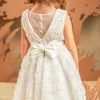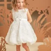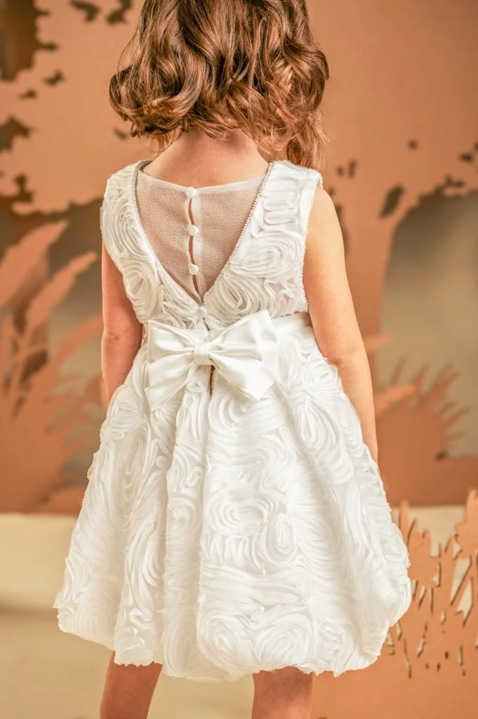 Ένα κουκλίστικο φόρεμα, φτιαγμένο εξολοκλήρου από μοναδικό ύφασμα με απλικέ κυματιστό μοτίφ σε off white απόχρωση, ντουμπλαρισμένο με τούλι γκλίτερ για διακριτική λάμψη. Το μπούστο απλό μπροστά, διαθέτει υπέροχη ανοιχτή πλάτη στο πίσω μέρος, ενώ η πλούσια φούστα μπαλούν με τη σατέν ζώνη στη μέση στολίζεται υπέροχα με σατέν φιόγκους. Το σύνολο ολοκληρώνεται με την τούλινη κορδέλα για τα μαλλιά διακοσμημένη με ένα μεγάλο σατέν φιόγκο ασορτί με το φόρεμα δίνοντας έμφαση στο girly look.