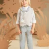 Ένα σύνολο που συνδυάζει κομψότητα και άνεση με μοναδικές λεπτομέρειες. Το δίπιετο βαμβακερό παντελόνι με την έξτρα λοξή ζώνη σε μπεζ απόχρωση και το σταυρωτό γιλέκο με τον γιακά κιμονό σε μπλε χρώμα από βαμβακερό μελανζέ ύφασμα δημιουργούν ένα υπέροχο αποτέλεσμα . Συνδυάζονται τέλεια με το σιελ βαμβακερό πουκάμισο και το μπλε παπιγιόν, ενώ για την τελική πινελιά, επιλέξτε ανάμεσα σε ψάθινο καπέλο ή υφασμάτινη τραγιάσκα, σύμφωνα με το προσωπικό σας στυλ.