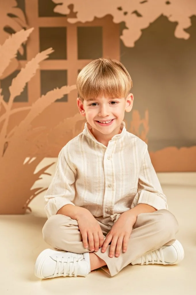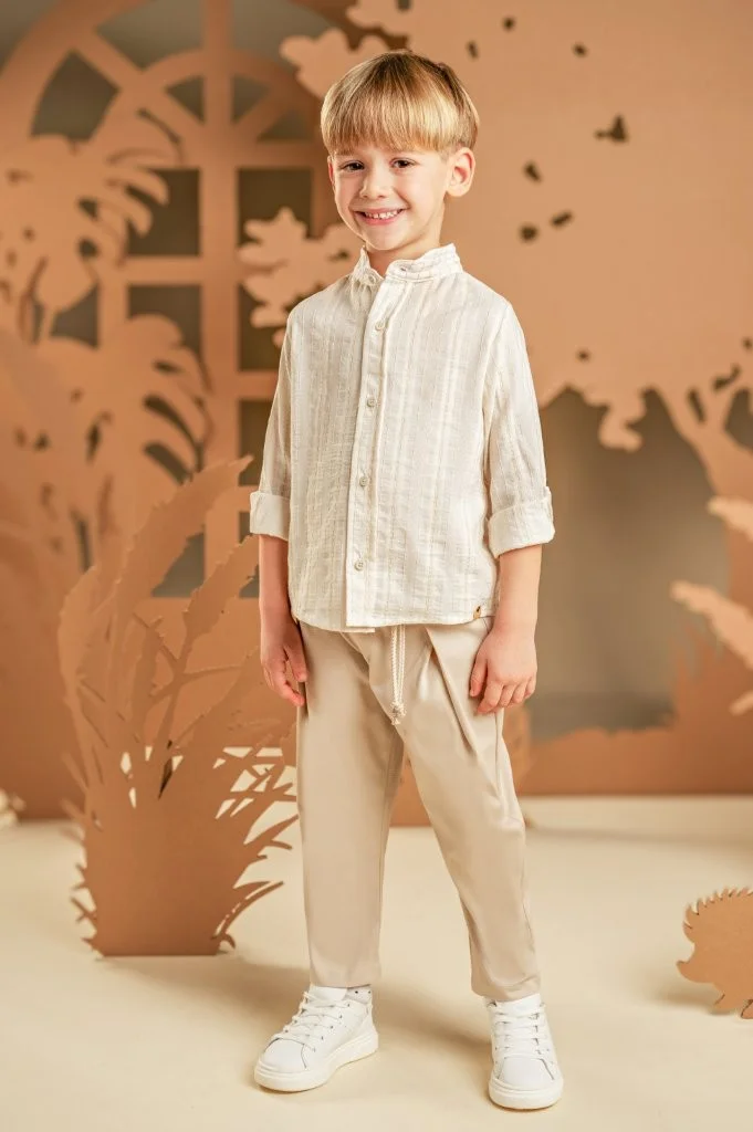 Ένα χαλαρό και casual look για αυτούς που προτιμάνε μια καλοκαιρινή εμφάνιση. Το σετ αποτελείται από παντελόνι βαμβακερό σε μπεζ χρώμα και πουκάμισο σε εκρού-μπεζ υφαντό ύφασμα με Μάο γιακά. Το σύνολο ολοκληρώνεται με το εμπριμέ φλοράλ φουλάρι Baby Bloom exclusive σε σαφράν-μέντα χρώμα και ανάλογα με το στιλ που προτιμάτε, ψάθινο καπέλο ή υφασμάτινη τραγιάσκα .