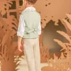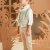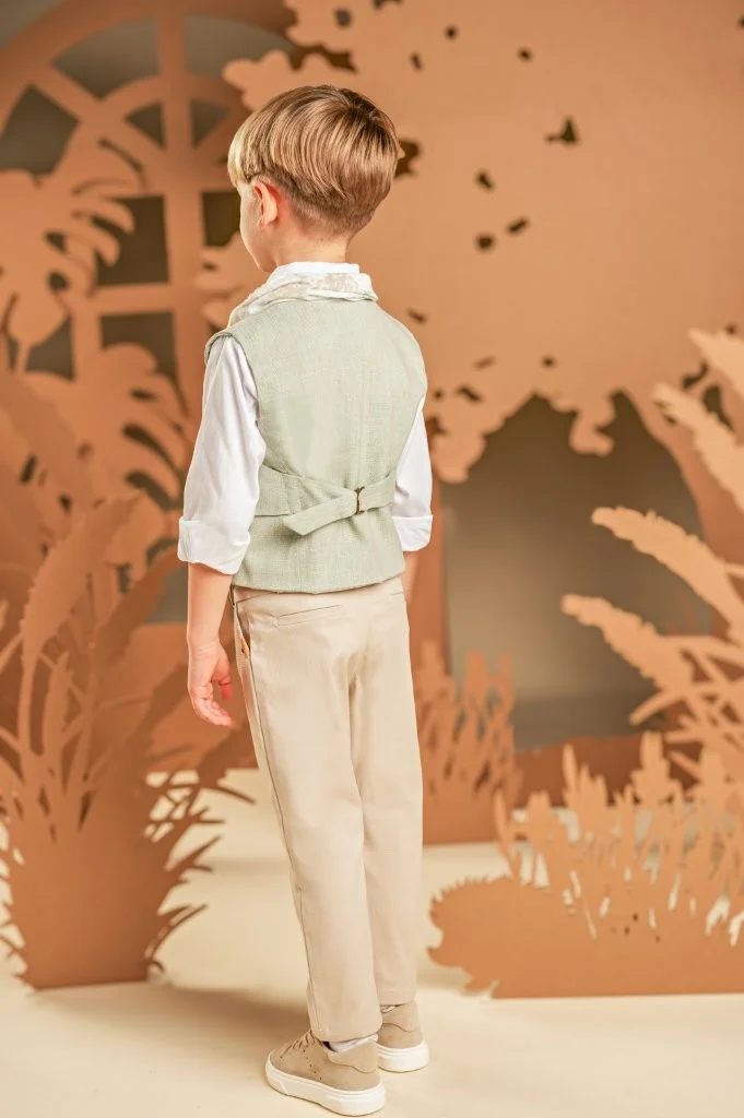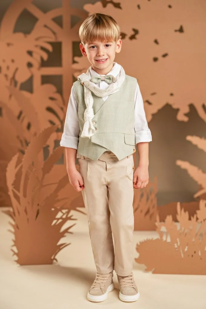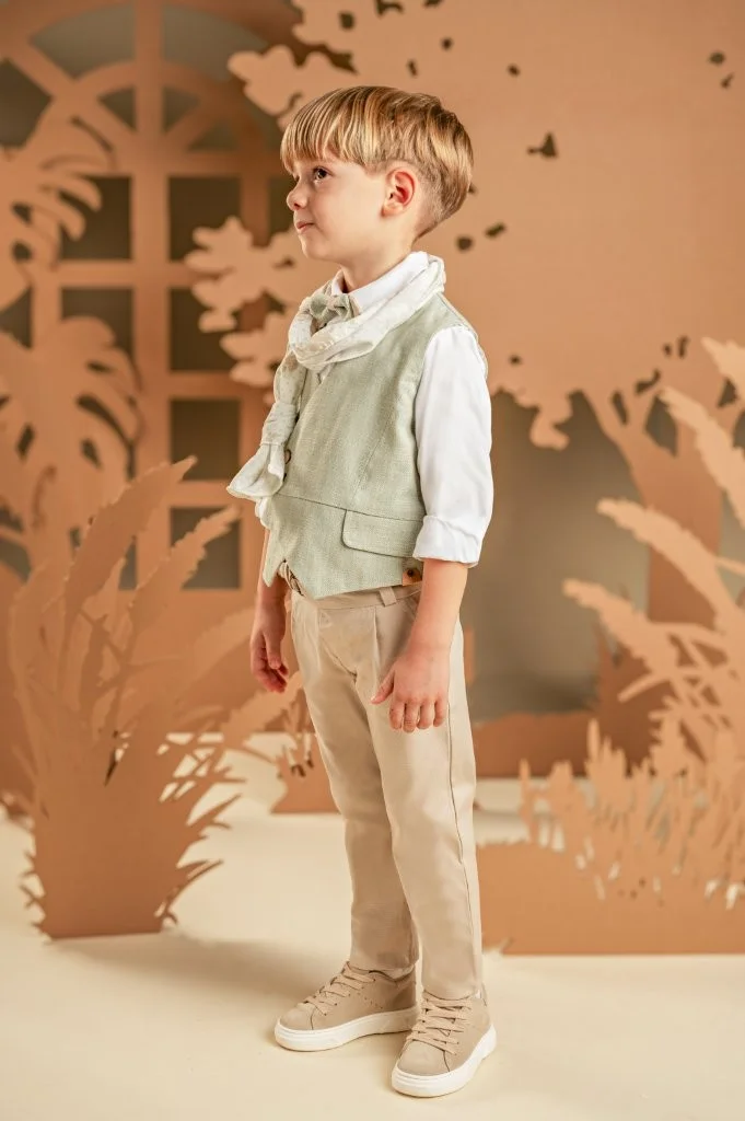 Για μια κομψή εμφάνιση, αυτό το σετ αποτελεί ιδανική επιλογή για κάθε ξεχωριστή περίσταση. Το βαβακερό παντελόνι σε ανοιχτή μπεζ απόχρωση ξεχωρίζει για το ιδιαίτερο σχέδιο στο ζωνάκι και συνδυάζεται άψογα με το σταυρωτό γιλέκο από υπέροχο ιταλικό ύφασμα viscose-cotton στους τόνους της μέντας και το βαμβακερό πουκάμισο σε off white. To look ολοκληρώνεται με το φουλάρι από βαμβακερό ύφασμα με μοναδικό baby bloom exclusive φλοράλ εμπριμέ σε μπεζ & μέντα αποχρώσεις, το παπιγιόν και ανάλογα με το στιλ που προτιμάτε ψάθινο καπέλο ή υφασμάτινη τραγιάσκα.