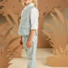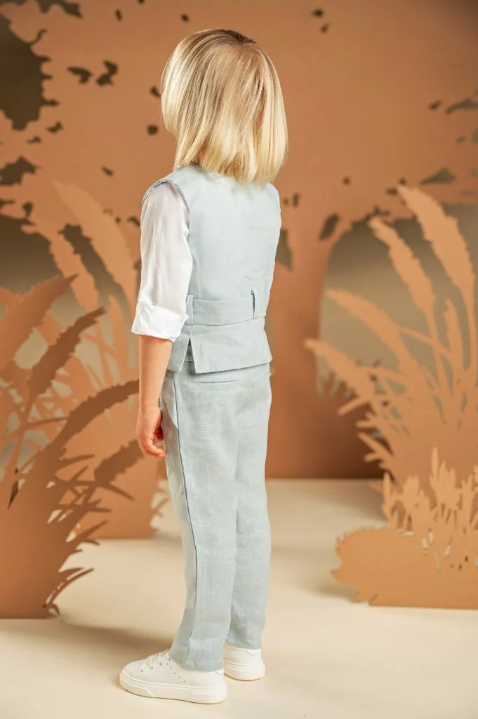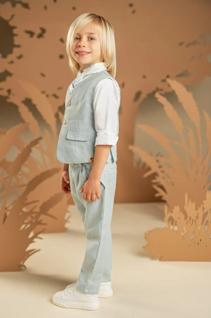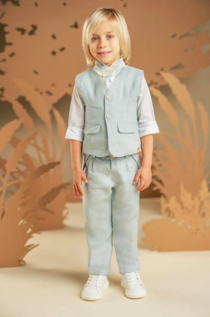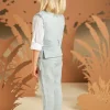 Ένα ραφινάτο σετ με μοναδικό στυλ φτιαγμένο εξολοκλήρου από λινό υψηλής ποιότητας σε σιελ χρώμα. Το σύνολο αποτελείται από παντελόνι, εξαιρετικό γιλέκο με ζώνη στο πίσω μέρος, λευκό βαμβακερό πουκάμισο με Mao γιακά και φουλάρι σε σιελ αποχρώσεις με exclusive τύπωμα Baby Bloom. Για την τελική πινελιά, επιλέξτε ανάμεσα σε ψάθινο καπέλο ή υφασμάτινη τραγιάσκα, σύμφωνα με το προσωπικό σας στυλ.