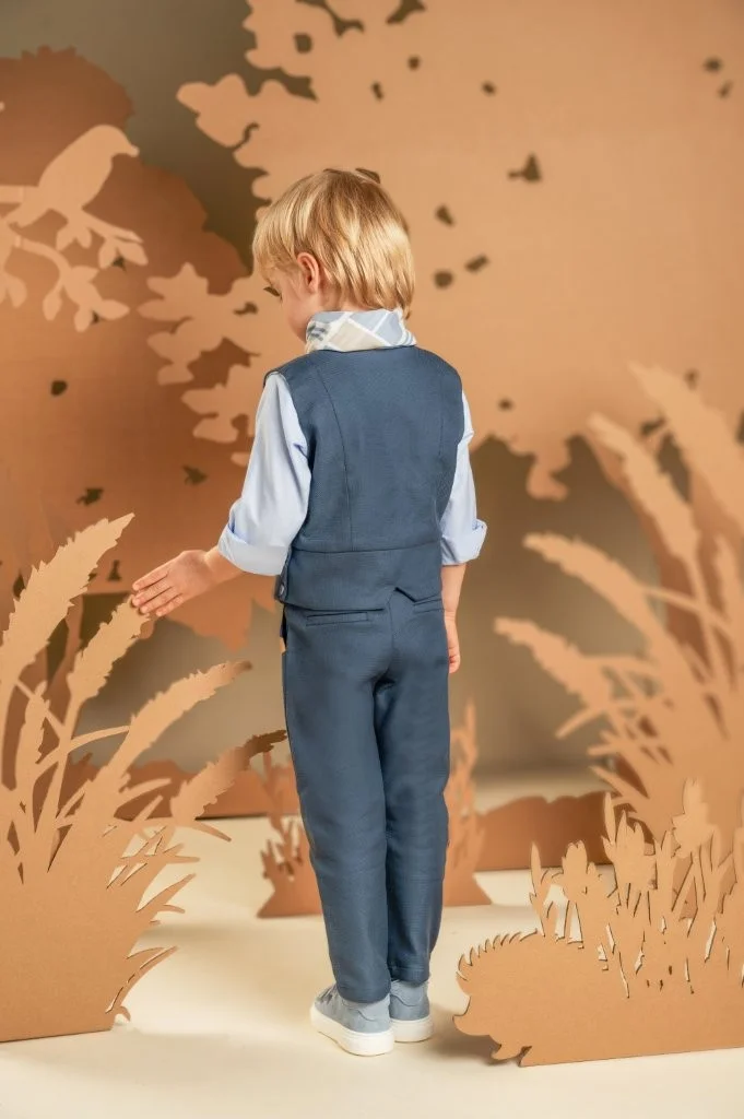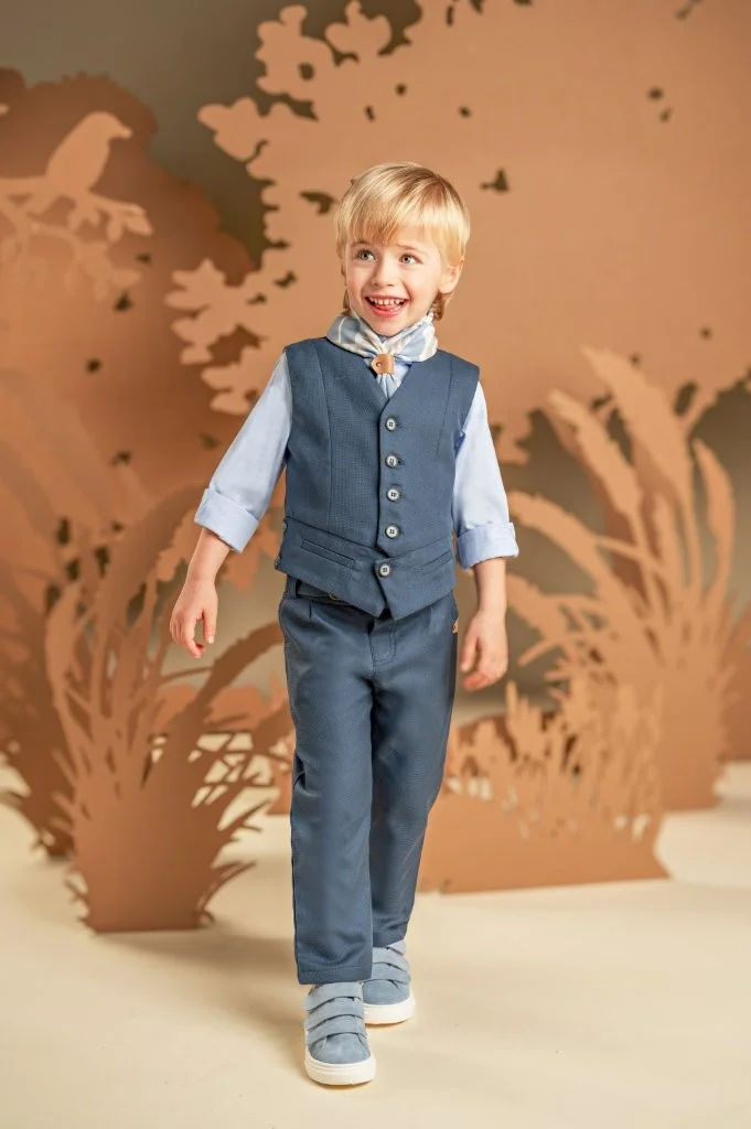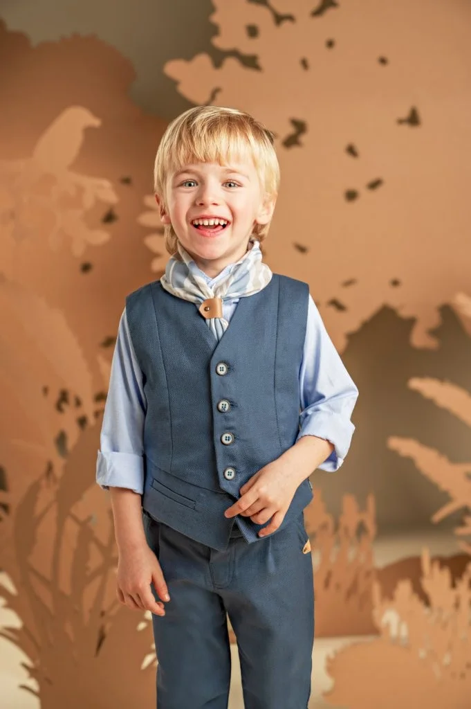 Ένα σετ με διαχρονική κομψότητα ιδανικό για όσους προτιμούν να ξεχωρίζουν διακριτικά . Το παντελόνι και το γιλέκο από μπλε βαμβακερό καμβά δημιουργούν ένα αρμονικό σύνολο, με το παντελόνι να ξεχωρίζει χάρη στη μοναδική του ζώνη και το γιλέκο να εντυπωσιάζει με το ιδιαίτερο design του. Το σιελ βαμβακερό πουκάμισο με Mao γιακά και το φουλάρι με τα γεωμετρικά σχέδια σε σιελ αποχρώσεις και exclusive τύπωμα Baby Bloom ολοκληρώνει μοναδικά το look. Για την τελική πινελιά, επιλέξτε ανάμεσα σε ψάθινο καπέλο ή υφασμάτινη τραγιάσκα, ανάλογα με το προσωπικό σας στυλ.