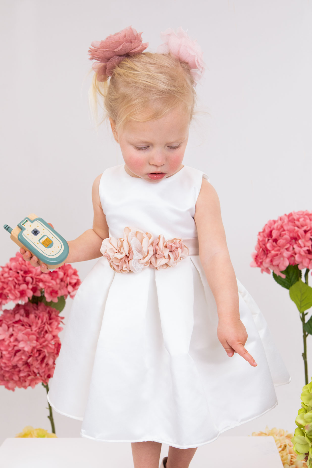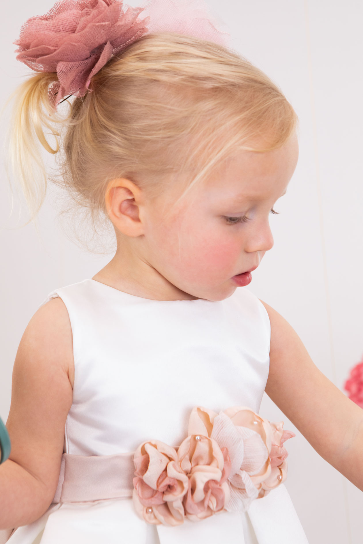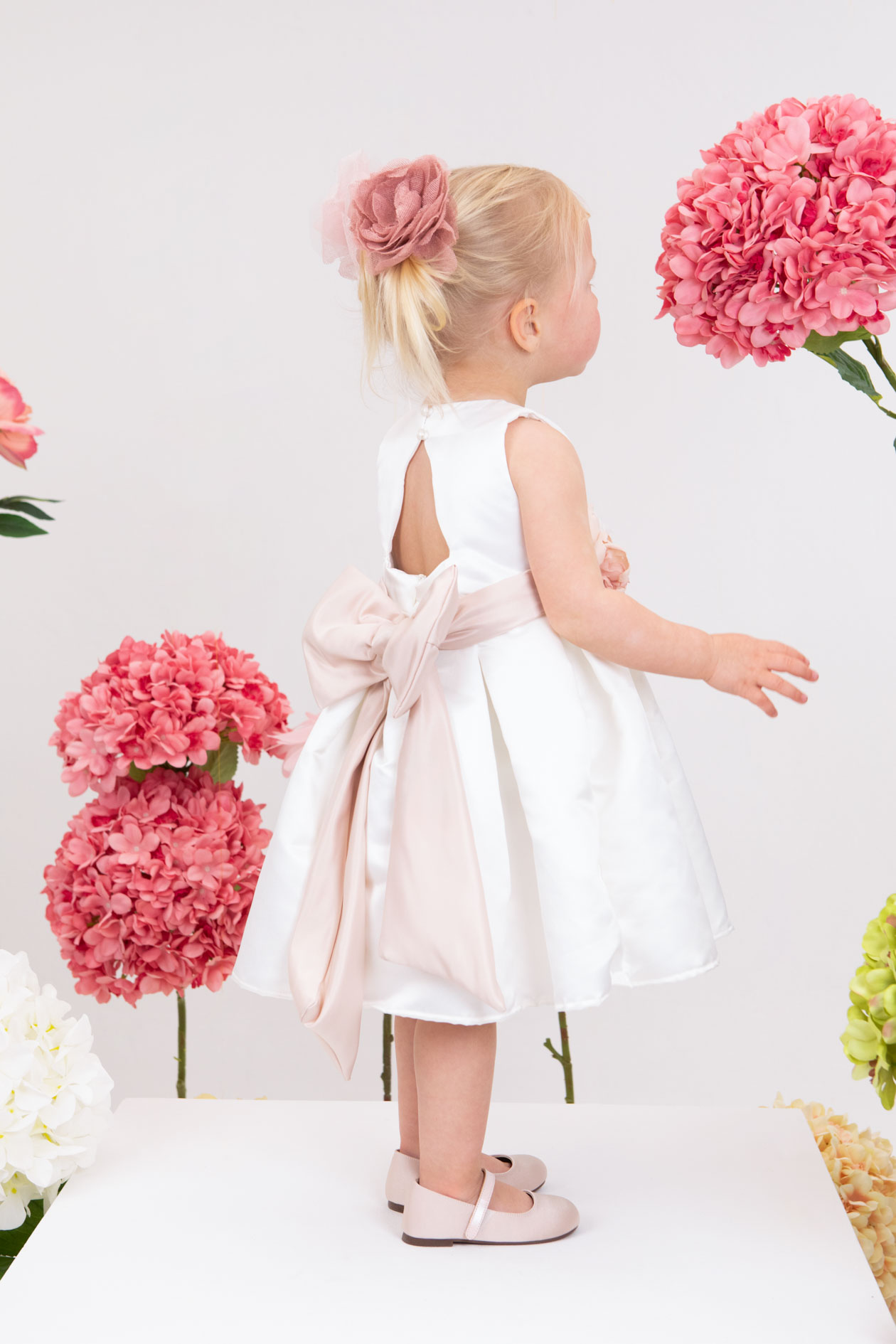 Η Nefelia είναι ένα εκρού σατέν φόρεμα βάπτισης με pink dusty σατέν ζώνη στολισμένη με χειροποίητα λουλούδια στο ίδιο χρώμα. Ο τεράστιος φιόγκος στο πίσω μέρος του ρούχου του δίνει μία παιχνιδιάρικη νότα. Το ρούχο ολοκληρώνει η κορδέλα για το κεφάλι. Έξτρα επιλογή το ζακετάκι.
