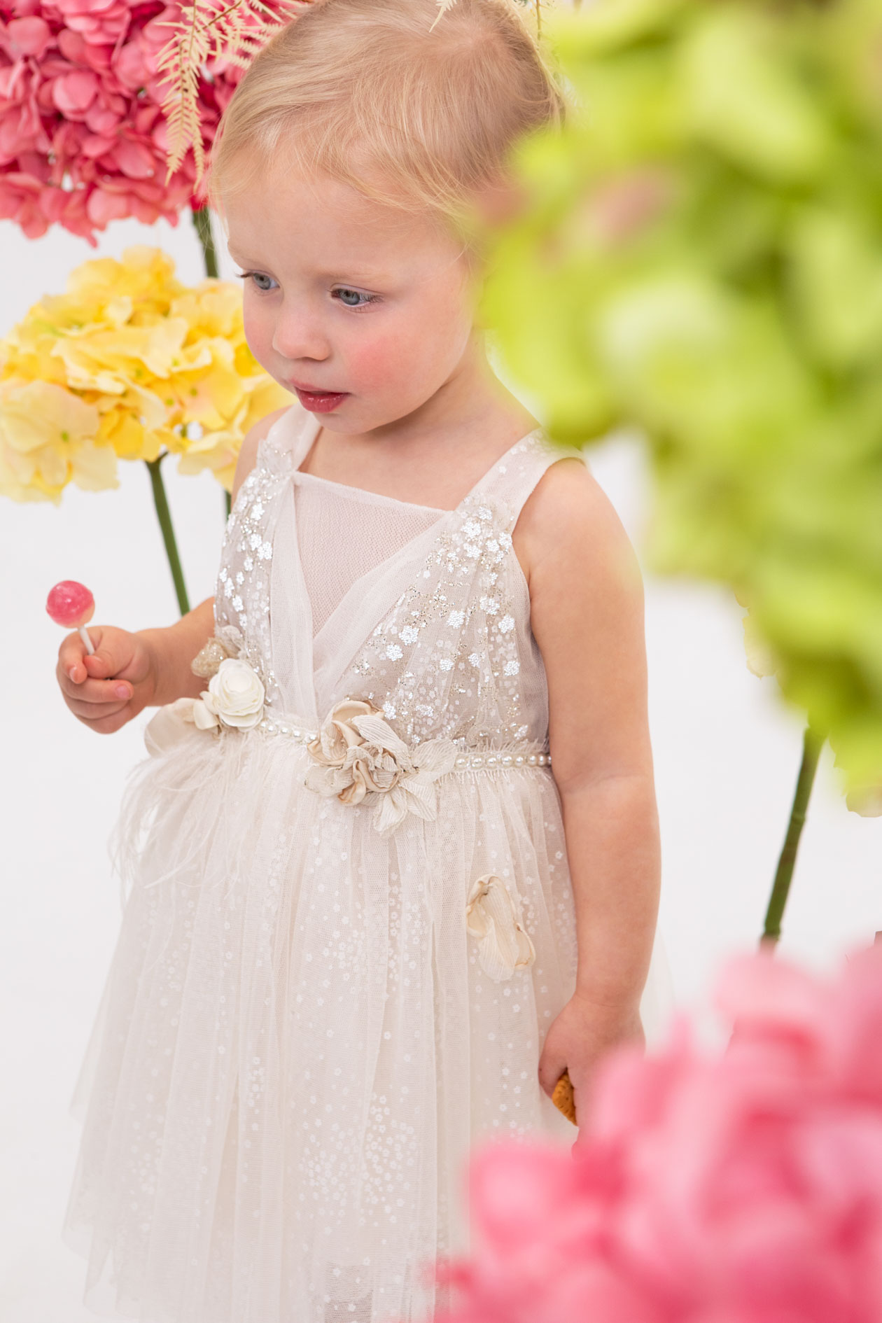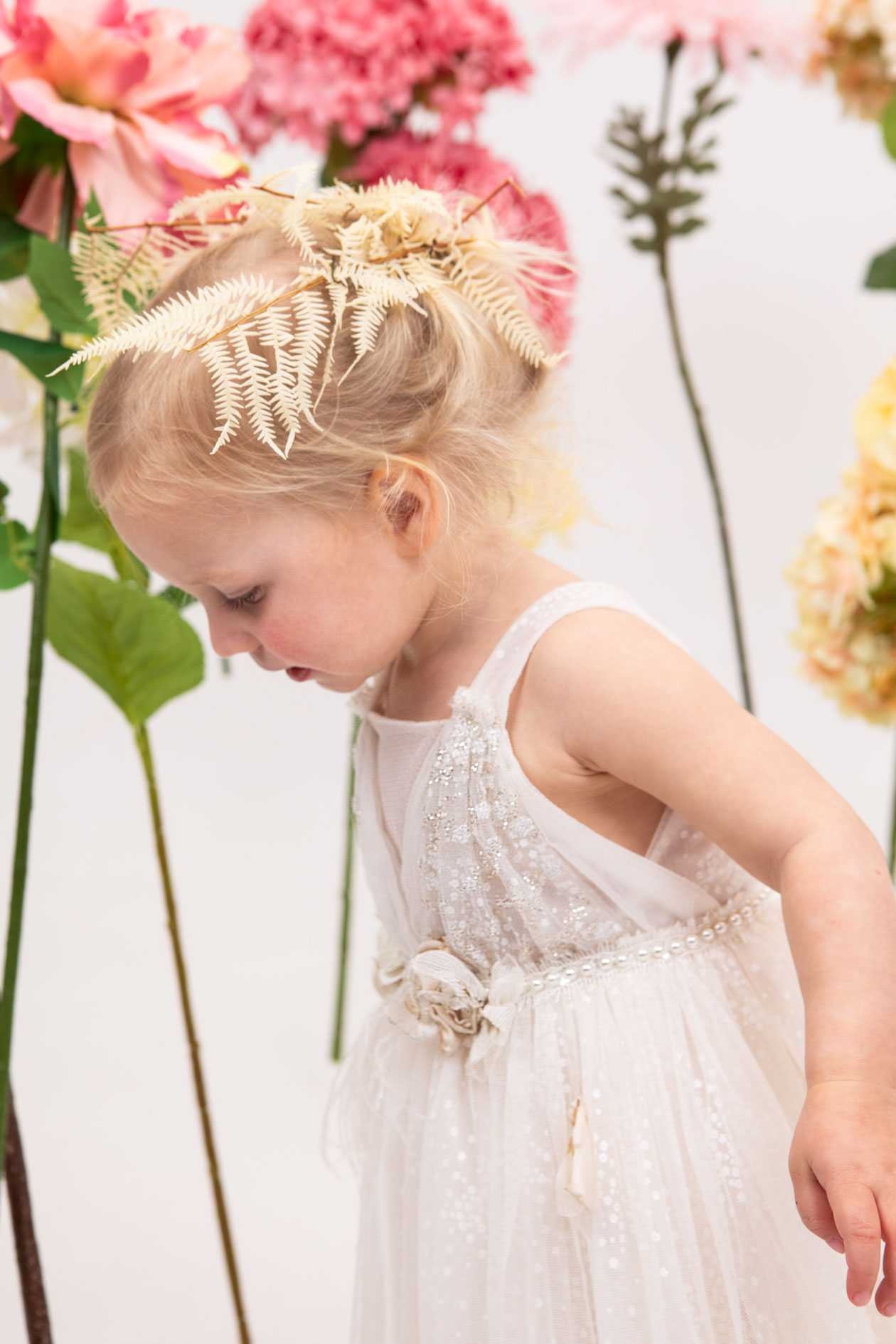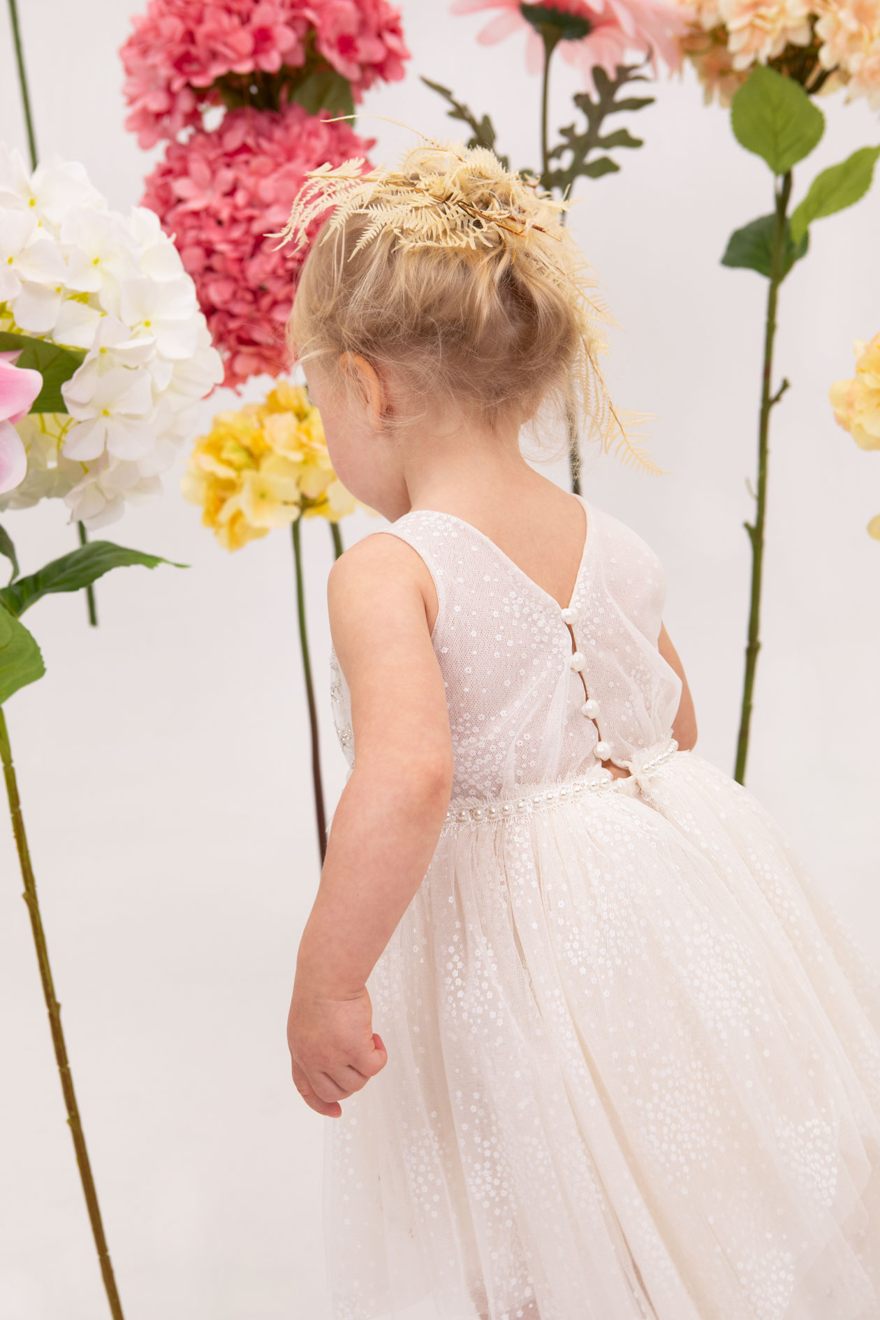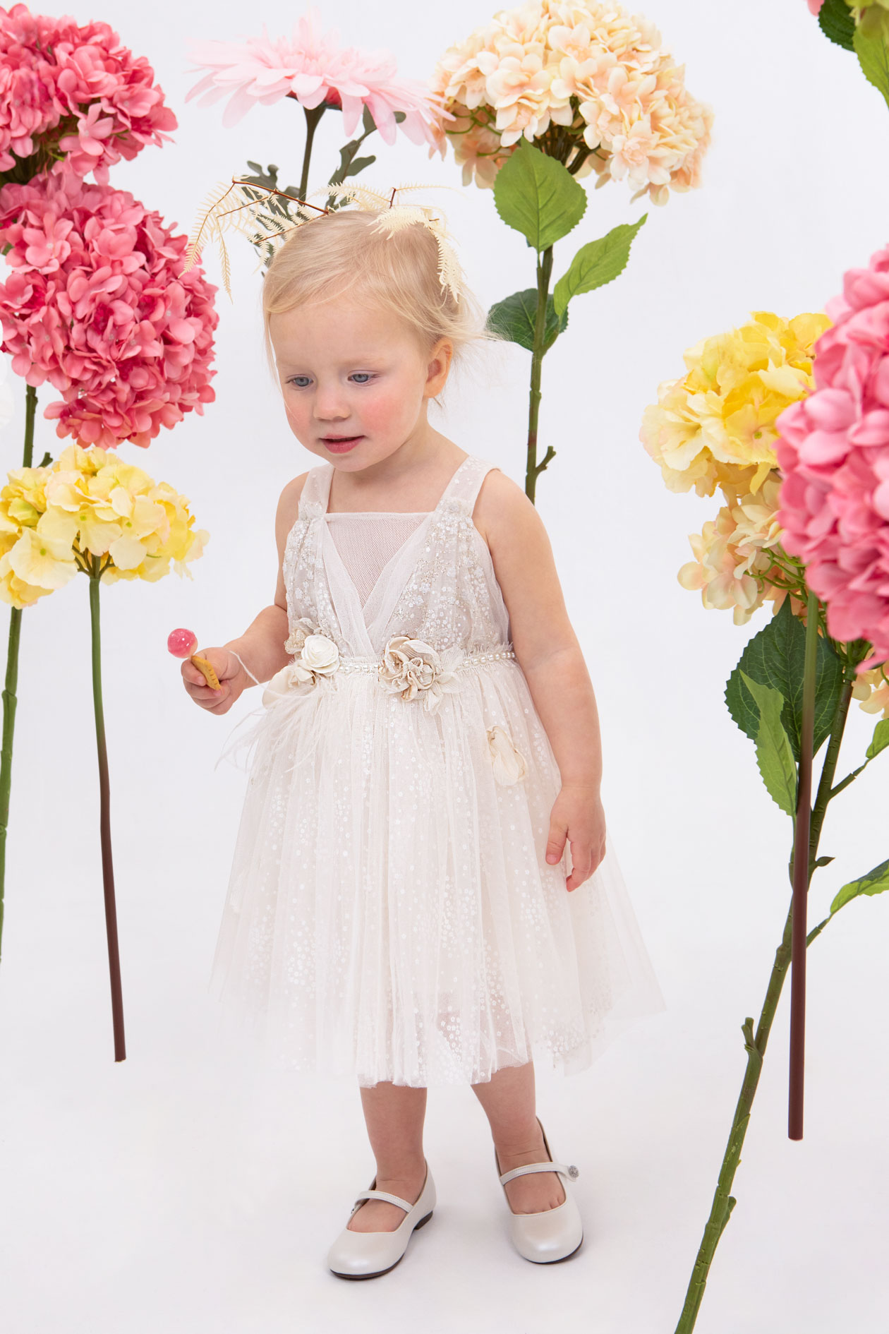 Η Neraida είναι ένα φανταστικό φόρεμα βάπτισης σε ιβουάρ-nude αποχρώσεις. Το layering των υφασμάτων σε συνδυασμό με χειροποίητα λουλούδια τα φτερά , τις πέρλες και το glitter δημιουργούν κάτι μαγικό. Το ρούχο το ολοκληρώνει κορδέλα με φτερά και χειροποίητα λουλούδια για το κεφάλι.