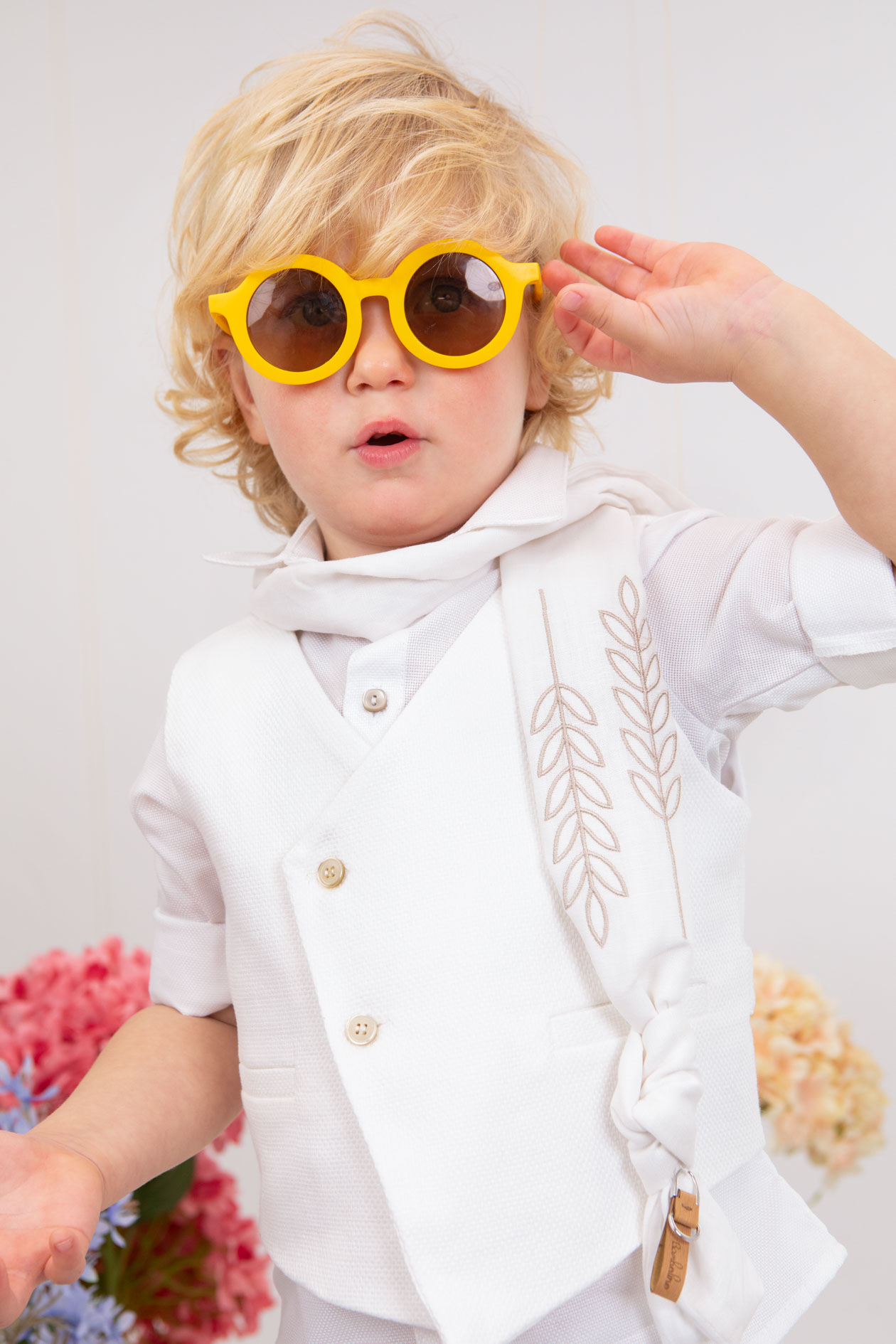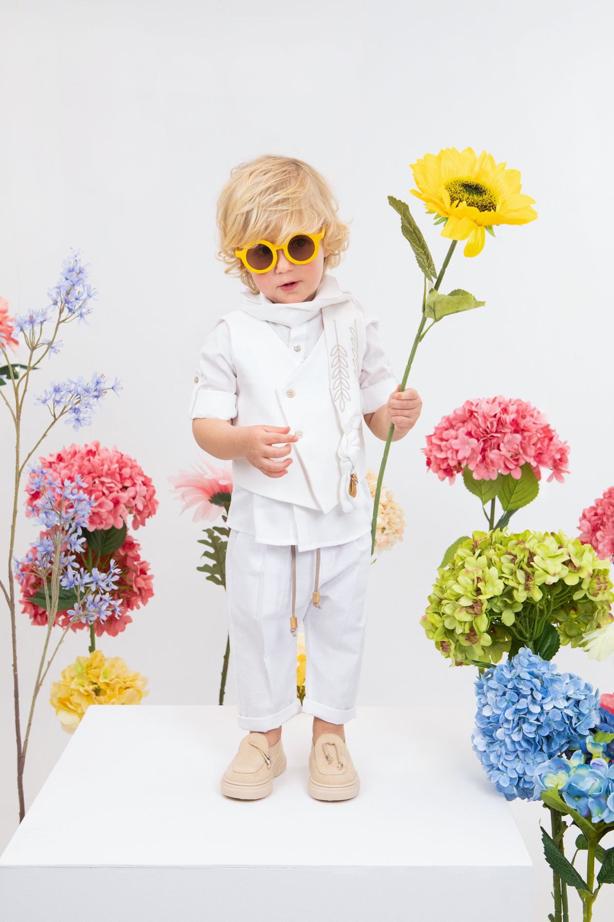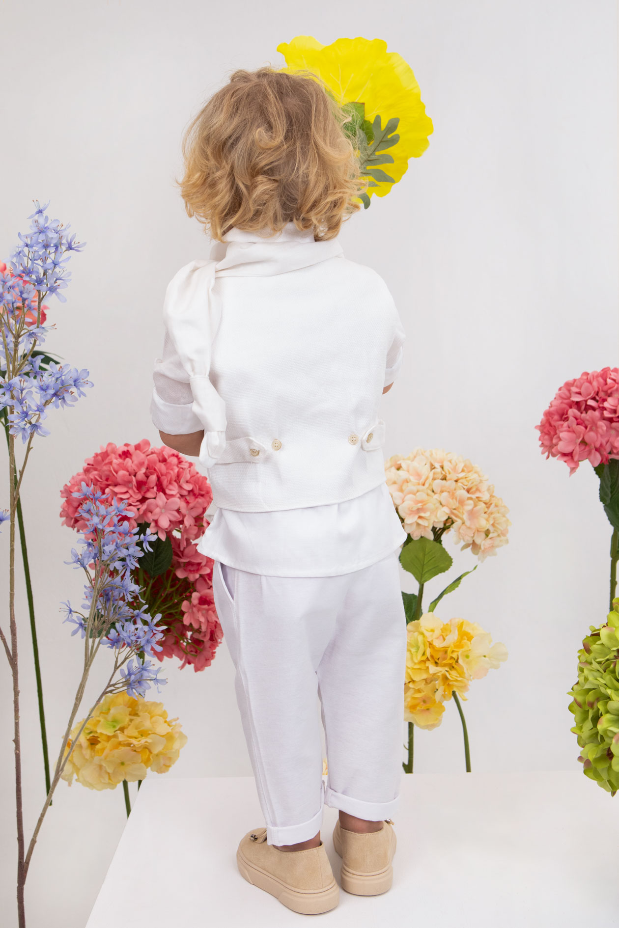Ο Nikolas είναι το απόλυτο ολόλευκο βαπτιστικό κοστούμι με μπεζ λεπτομέρειες.