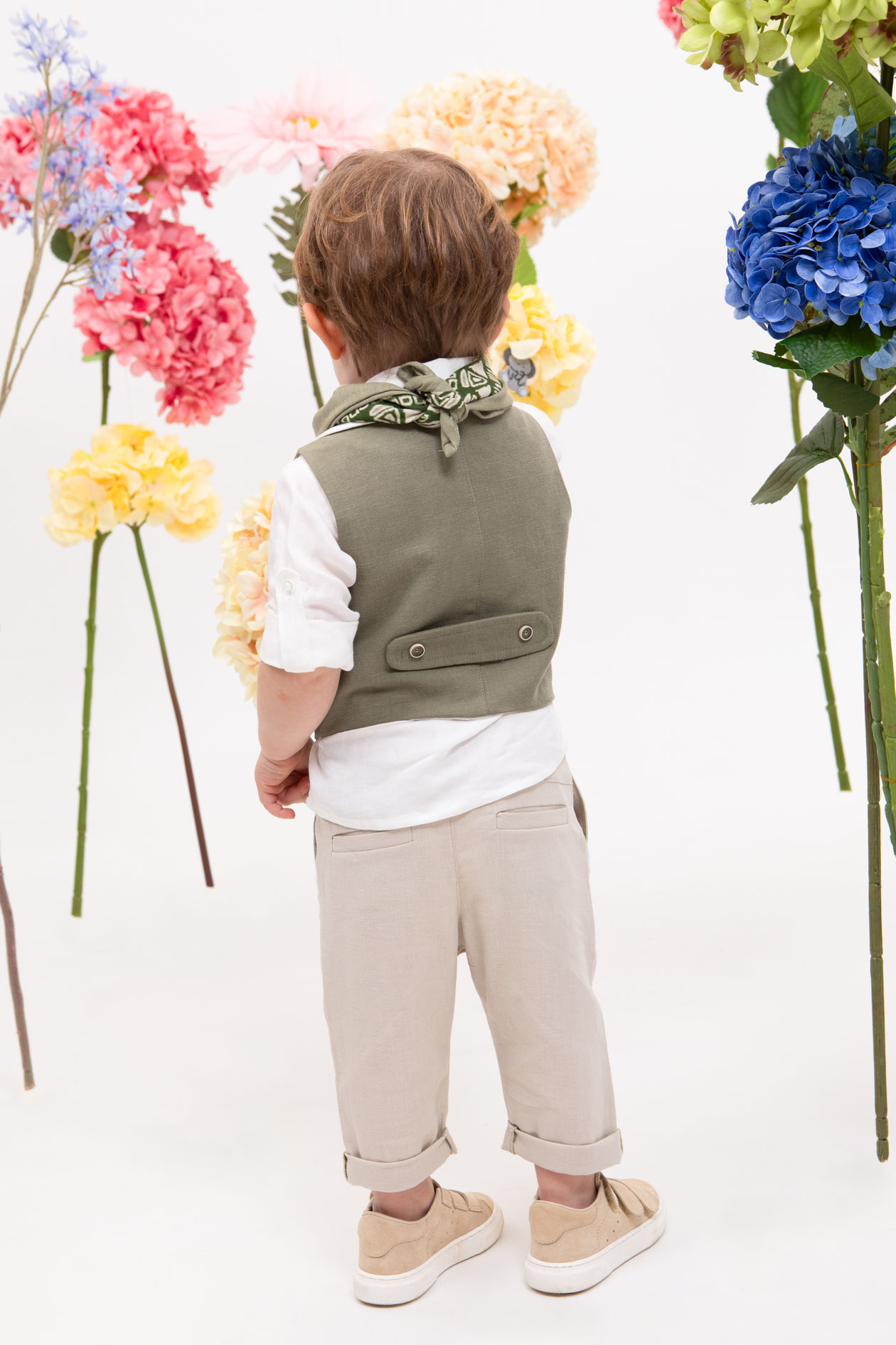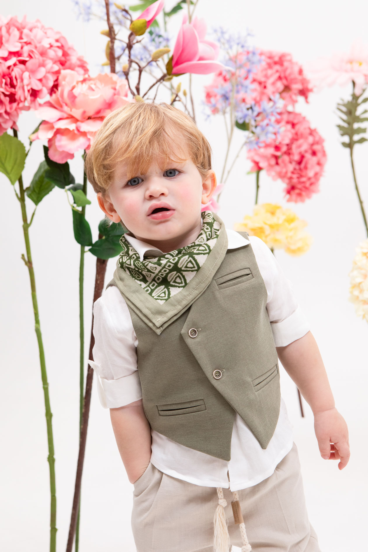 Ο Stratos είναι ένας all-time favourite συνδυασμός με chic λεπτομέρειες. Αποτελείται από μπεζ λινό παντελόνι με πιέτες και λάστιχο στην μέση, εκρού λινό πουκάμισο και στραβό λαδί γιλέκο το οποίο είναι διακοσμημένο με ιδιαίτερα κουμπιά. Αξεσουάρ είναι το κορδόνι για ζώνη, το εκπληκτικό φουλάρι σε πράσινο-μπεζ-λαδί απόχρωση και το λευκό καβούρι.