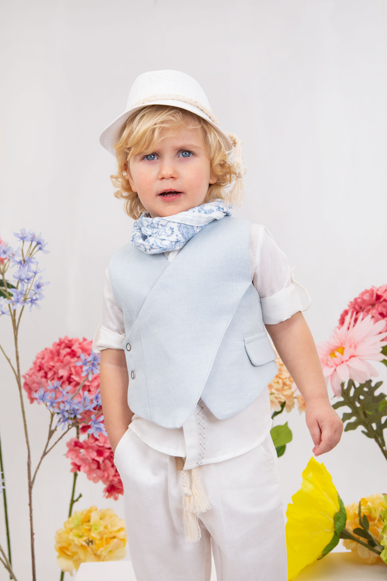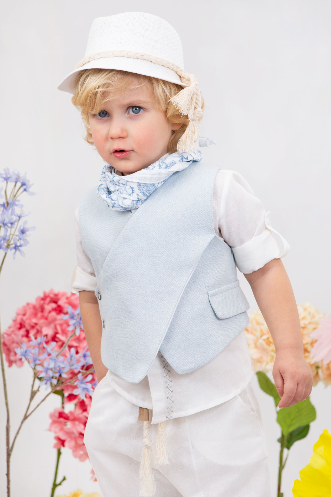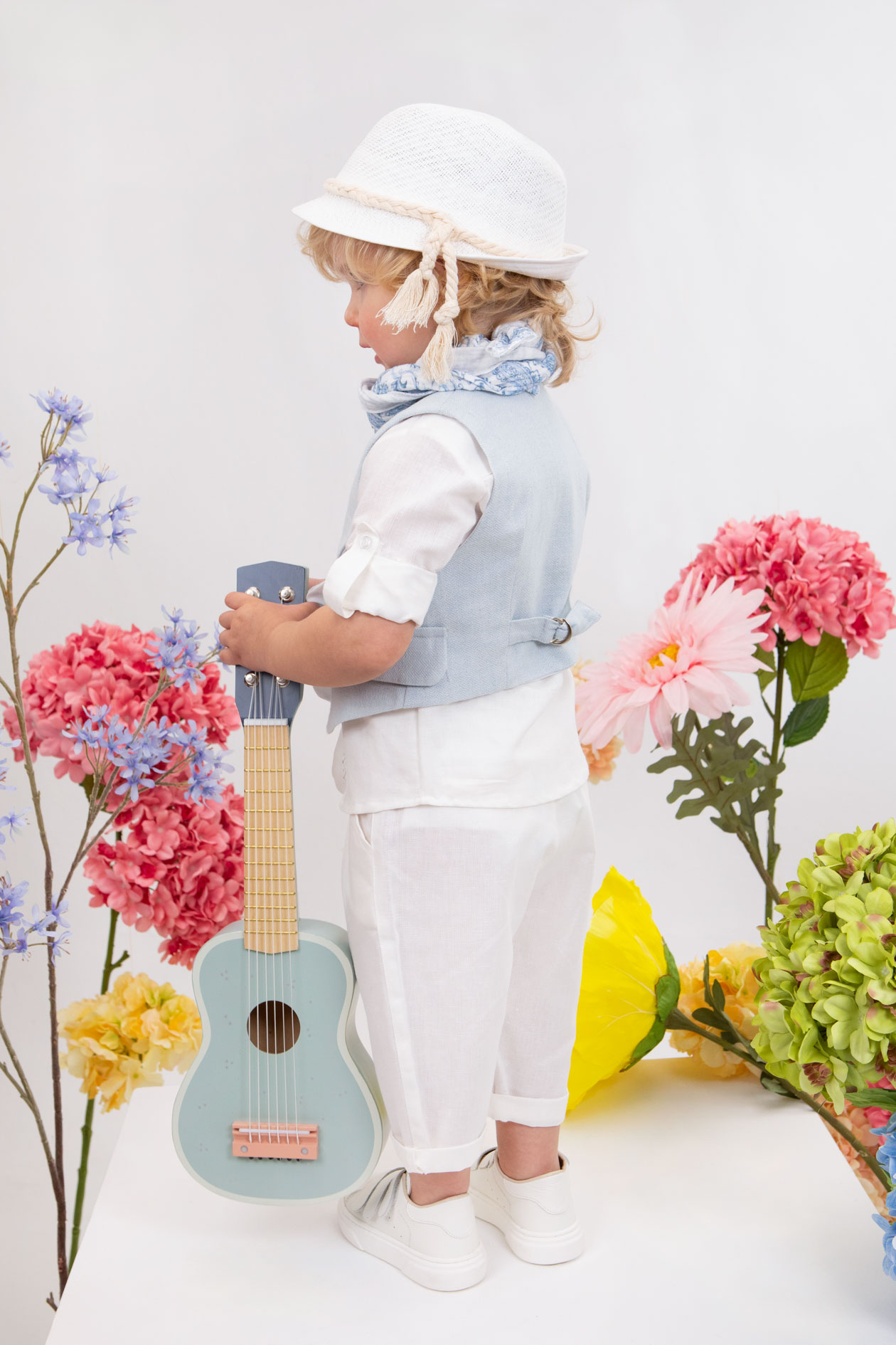 Ο Fabio είναι ένας συνδυασμός που έχετε αγαπήσει πολύ. Αποτελείται από λευκό λινό παντελόνι, λευκό λινό πουκάμισο με μάο γιακά και κέντημα υψηλής ποιότητας και σιέλ ψαροκόκκαλο γιλέκο. Αξεσουάρ είναι το εκρού-μπεζ κορδόνι για ζώνη, το λευκό καβούρι και το printed φουλάρι.