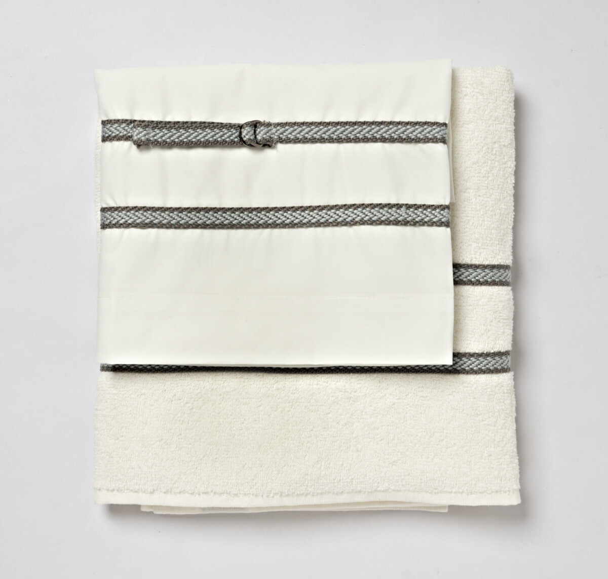 Βαμβακερά λαδόπανα σε ιβουάρ χρώμα με διπλό ιμάντα γκρί στο τελειωμά του και ιδιαίτερο δέσιμο. Τα λαδόπανα περιλαμβάνουν μεγάλη πετσέτα και σεντόνι , πετσέτα μικρη και εσώρουχα .