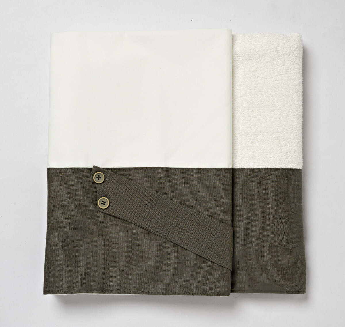 Βαμβακερά λαδόπανα σε ιβουάρ χρώμα με φάσα στο τελείωμα χακί με ιδιαίτερο σχέδιο και κουμπάκια. Τα λαδόπανα περιλαμβάνουν μεγάλη πετσέτα και σεντόνι , πετσέτα μικρη και εσώρουχα .