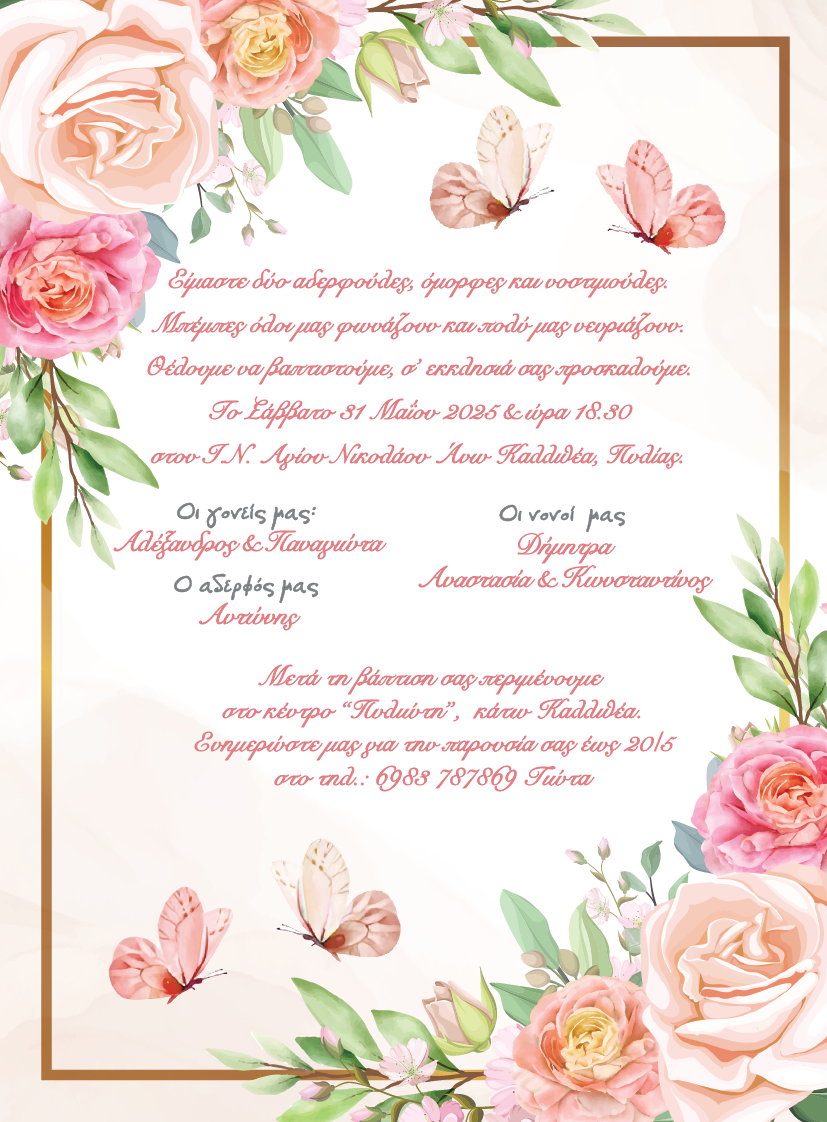 Προσκλητήριο Βάπτισης με θέμα Λουλούδι πεταλούδα